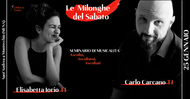 Carlo Carcano ed Elisabetta Iorio propongono un seminario di musicalità pre-milonga dal titolo ‘Ascolta, ascoltami, ascoltati’. Carlo ed Elisabetta ci porteranno in un mondo di tango fatto di ascolto individuale e reciproco, di connessione di coppia e anche di divertimento di gruppo.